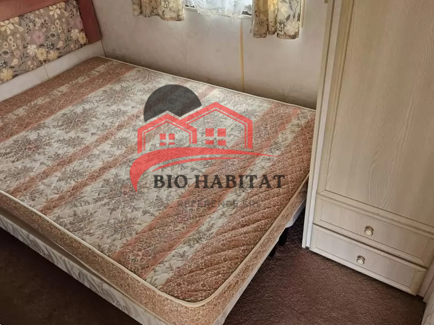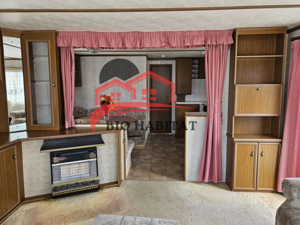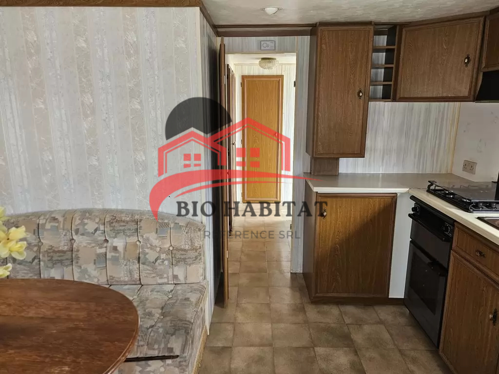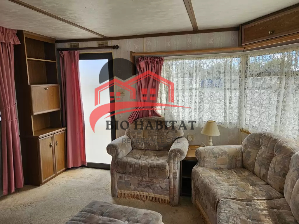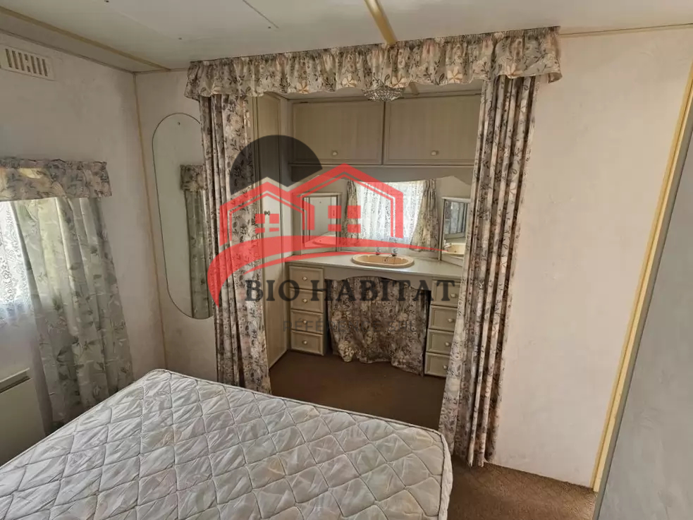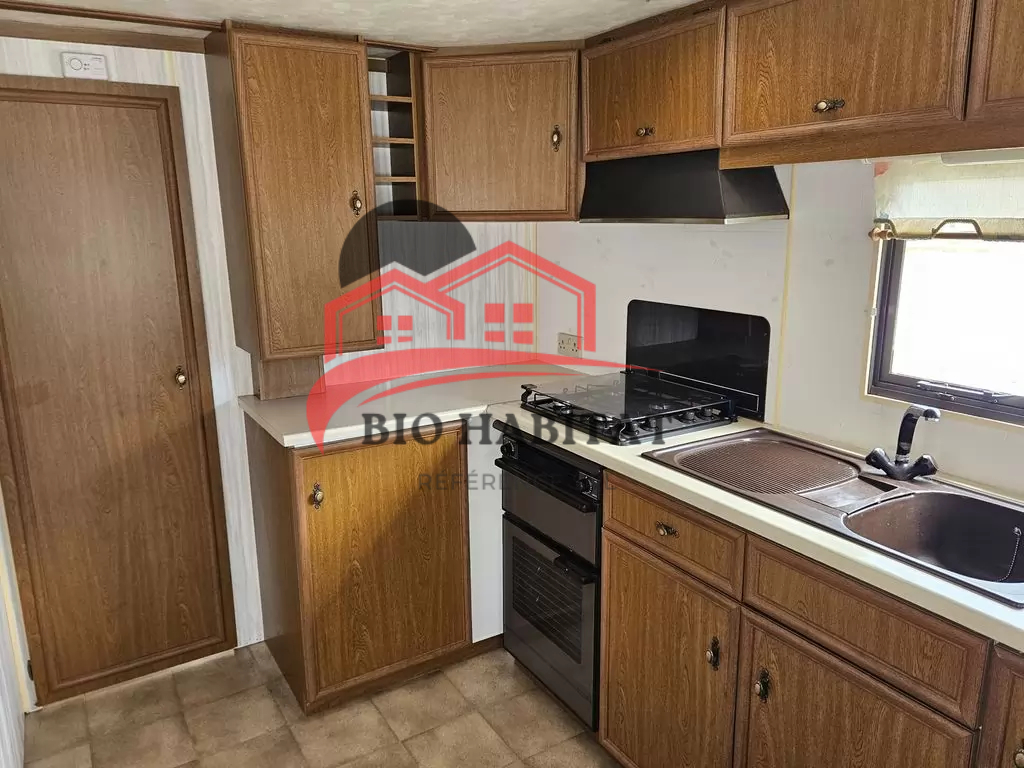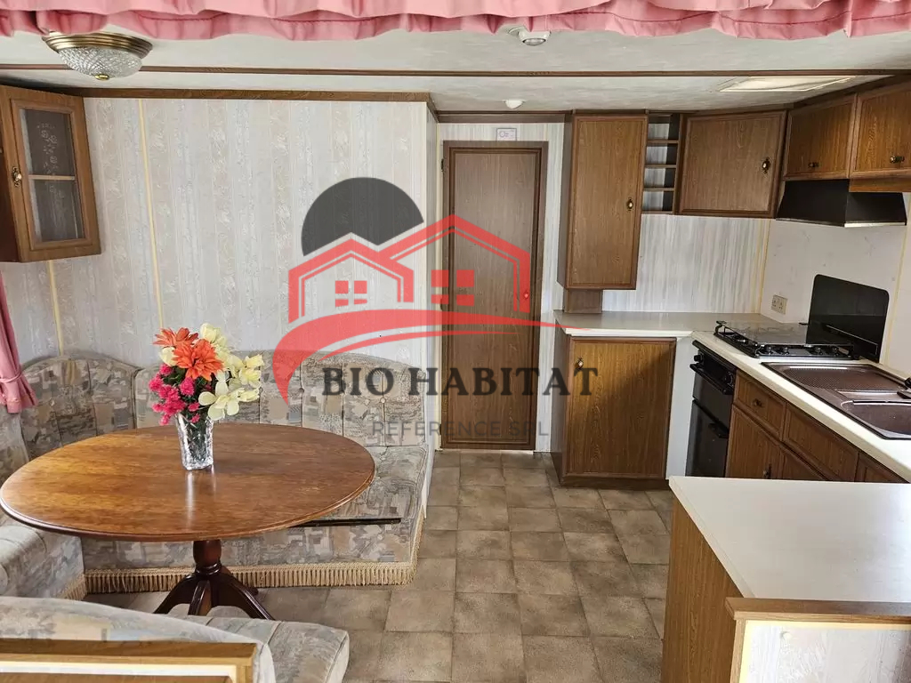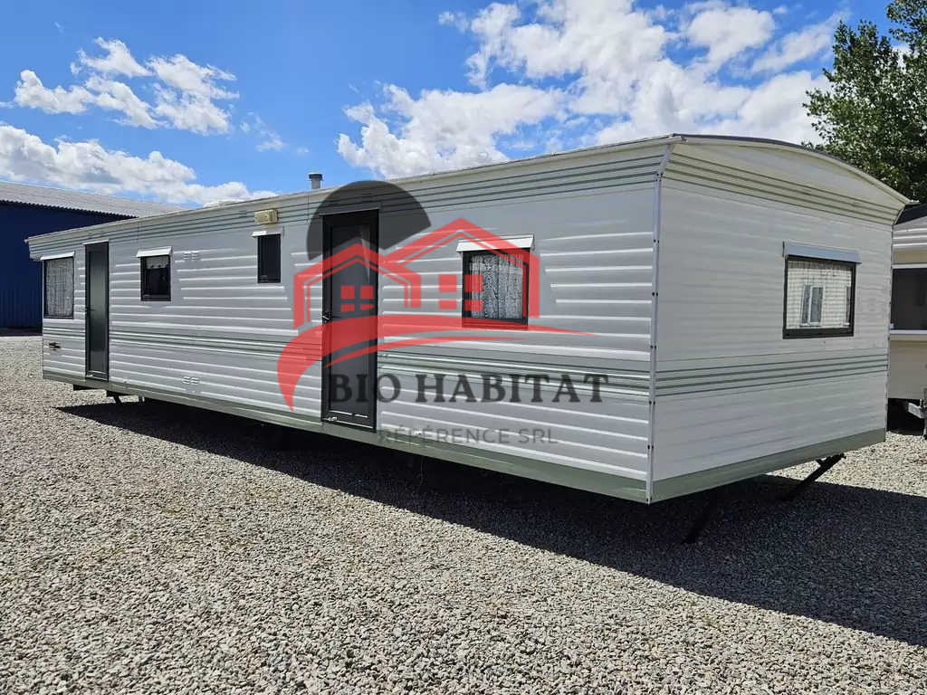 Mobil-home extra large, très agréable et entièrement équipé de 11,1 x 3,7 m avec deux entrées. Séjour, coin repas, cuisine en U avec électroménager, chambre (lit double) avec lavabo, chambre (lit double), salle de bain avec douche et baignoire, WC séparés avec lavabo. Cheminée à gaz, radiateurs électriques et chauffe-eau à gaz.