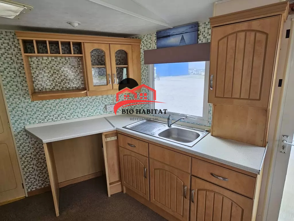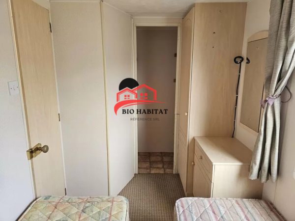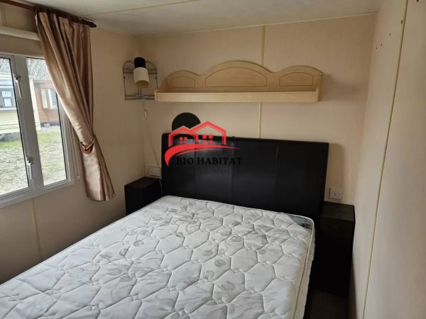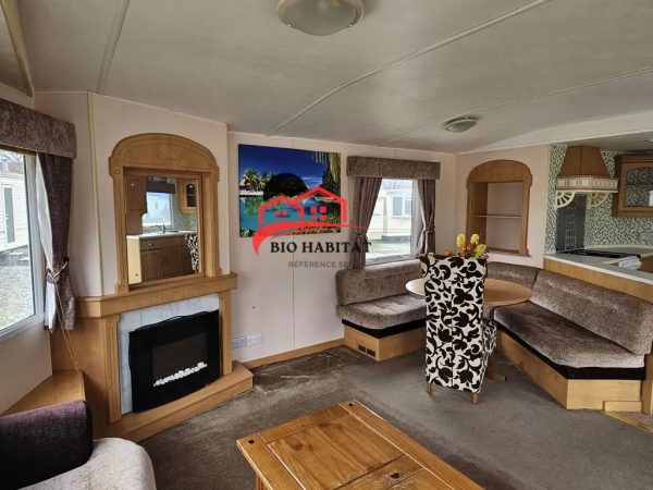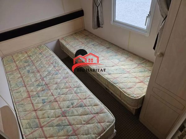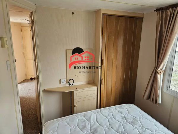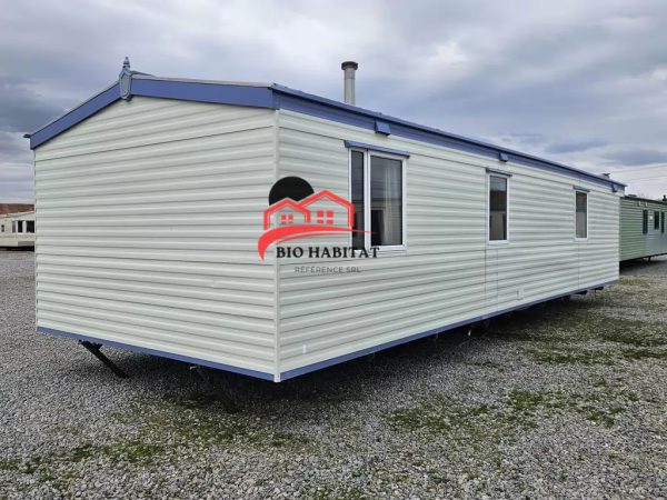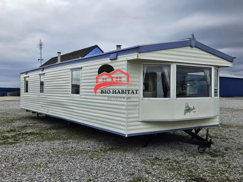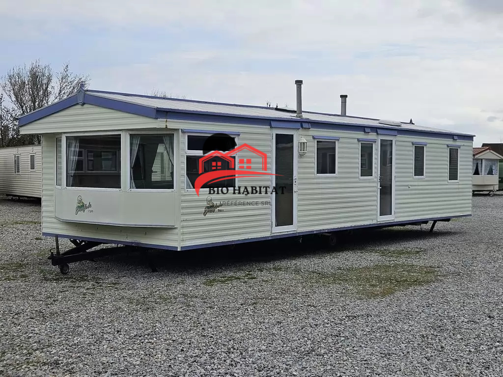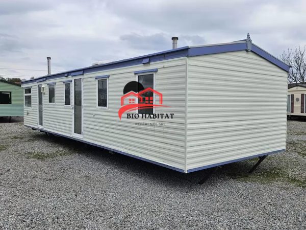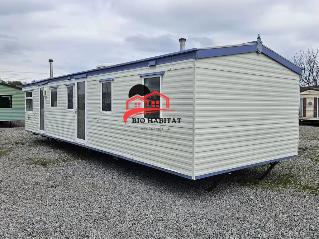 Mobil-home extra large, magnifique et entièrement équipé de 11,3 x 3,7 m avec deux entrées, toit à pignon, doubles fenêtres et portes isolées (dithermie). Spacieux séjour, coin repas, cuisine spacieuse, chambre (lit double), chambre (2 lits), salle de bain avec douche à l’italienne et baignoire siège, WC séparés. Cheminée électrique, chauffe-eau au gaz. Plafond surélevé !