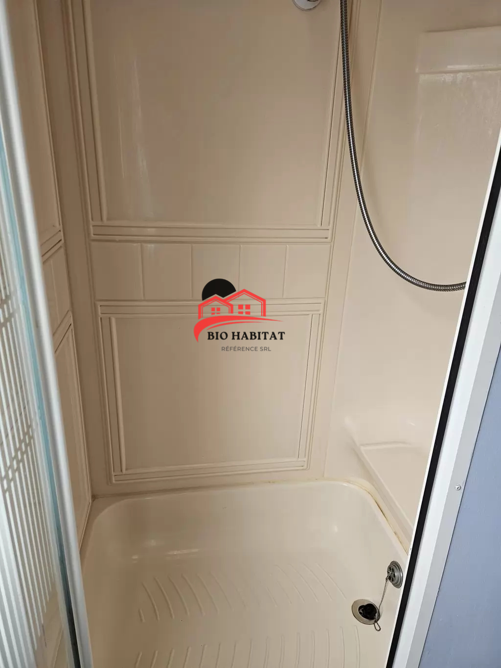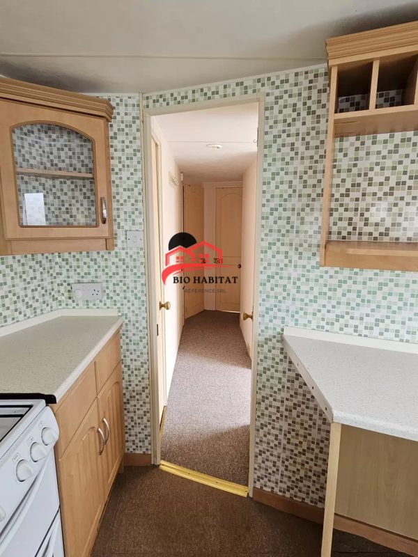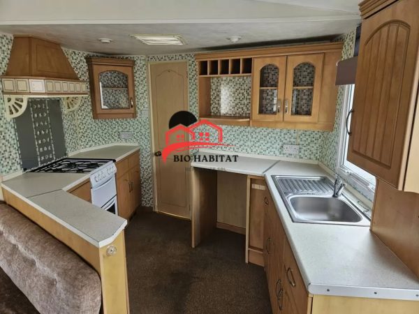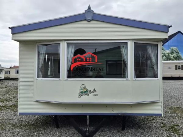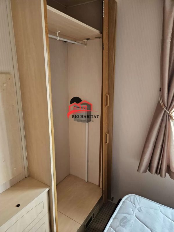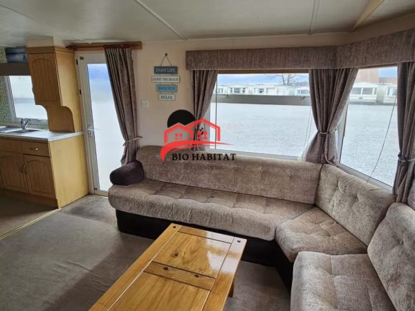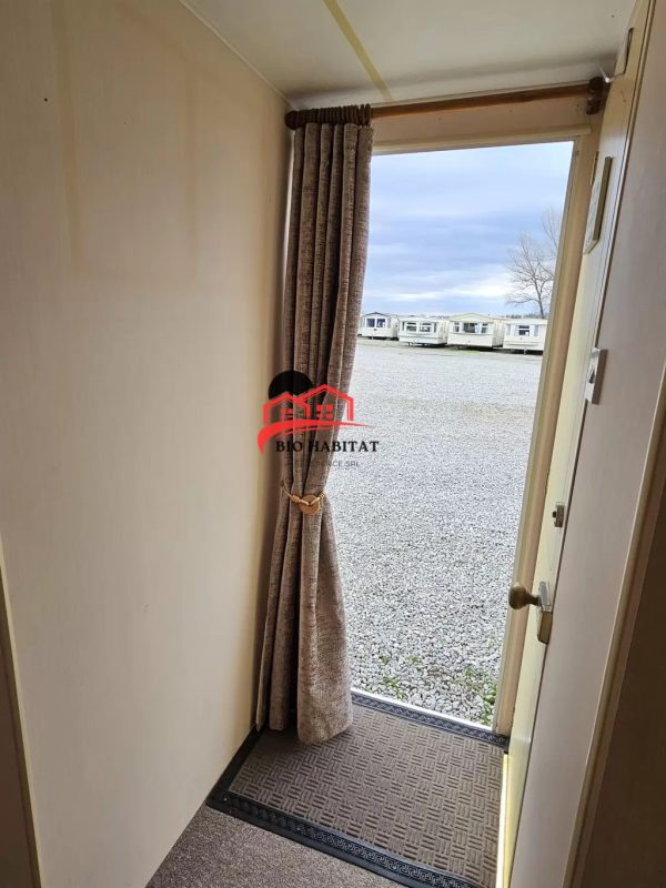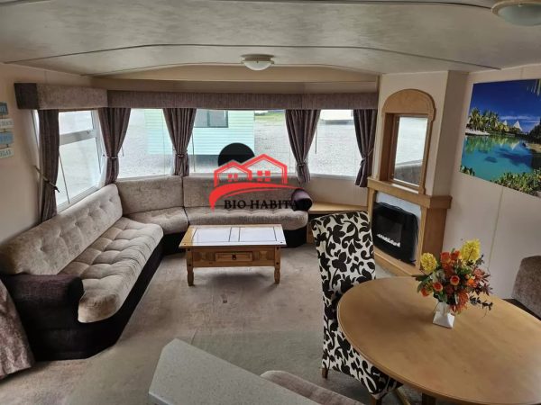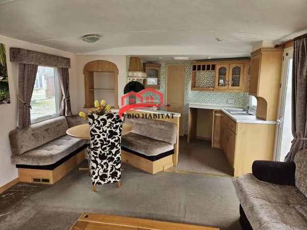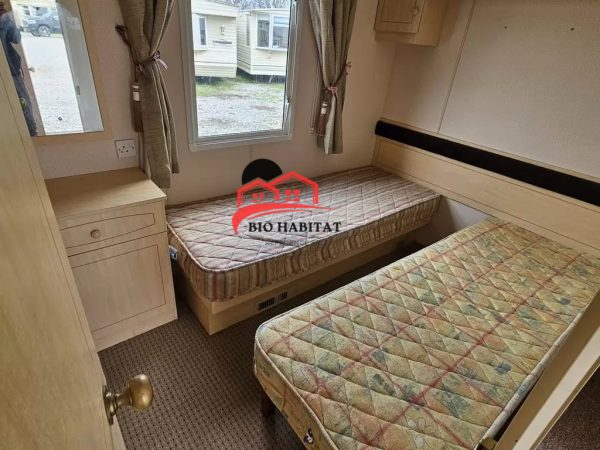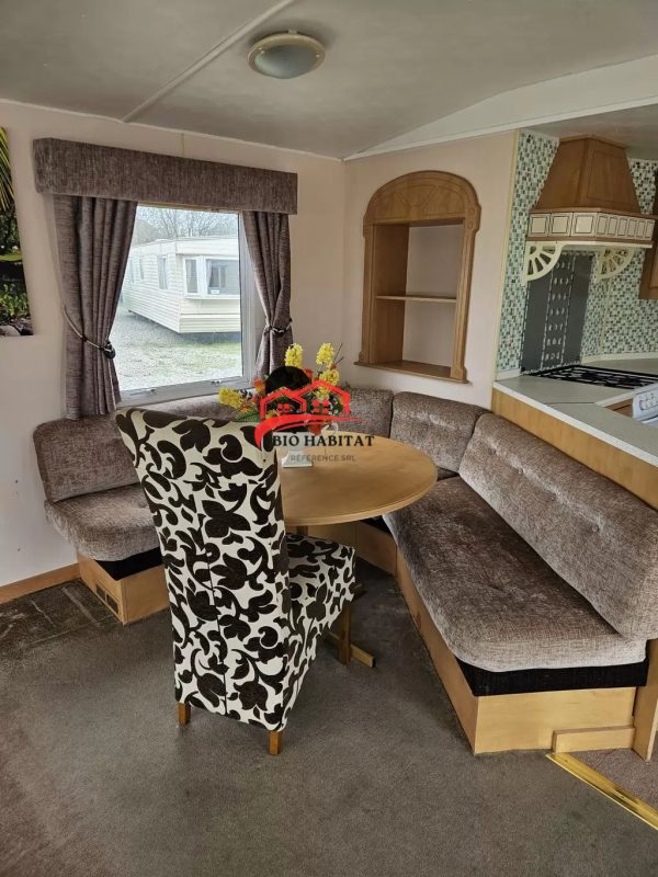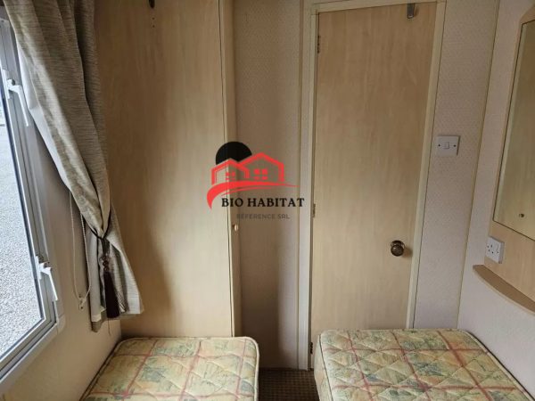 Mobil-home extra large, magnifique et entièrement équipé de 11,3 x 3,7 m avec deux entrées, toit à pignon, doubles fenêtres et portes isolées (dithermie). Spacieux séjour, coin repas, cuisine spacieuse, chambre (lit double), chambre (2 lits), salle de bain avec douche à l’italienne et baignoire siège, WC séparés. Cheminée électrique, chauffe-eau au gaz. Plafond surélevé !
