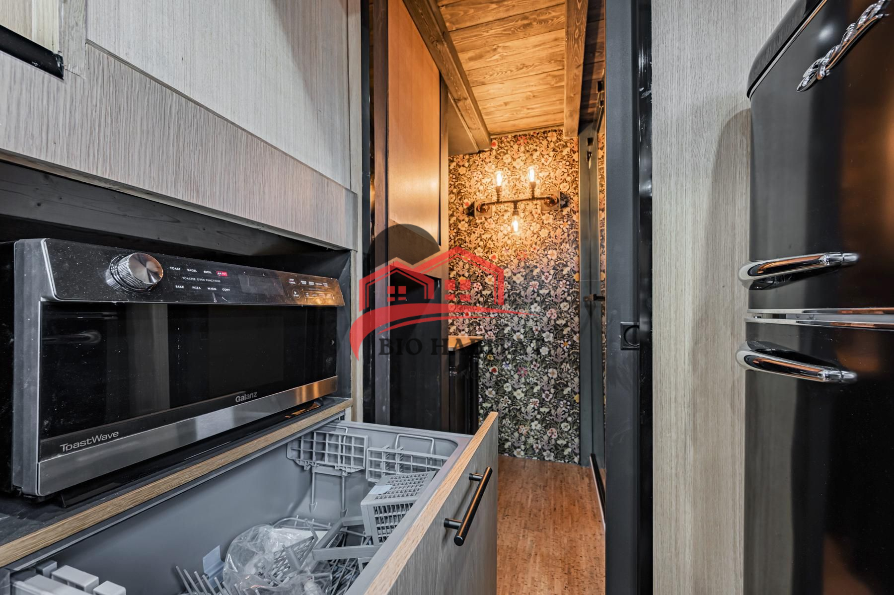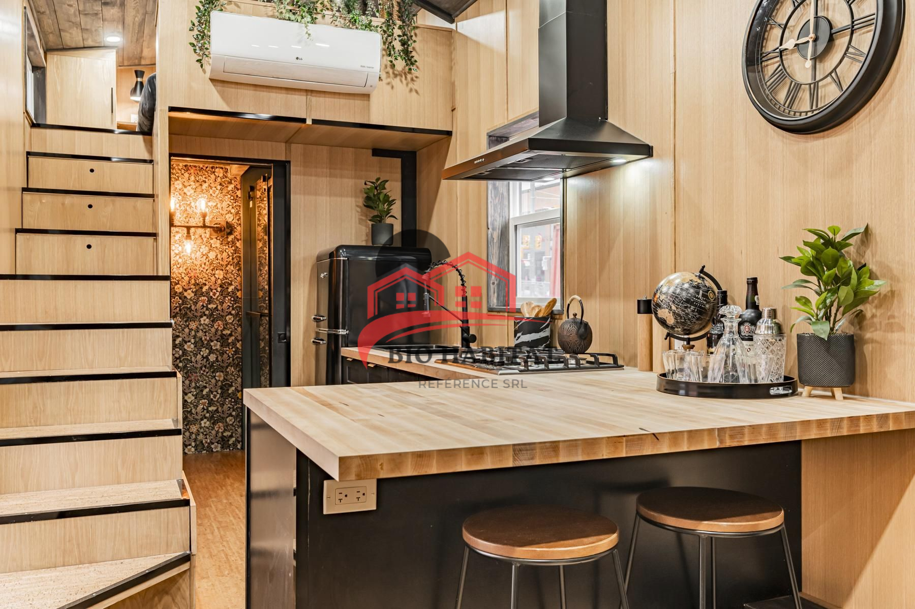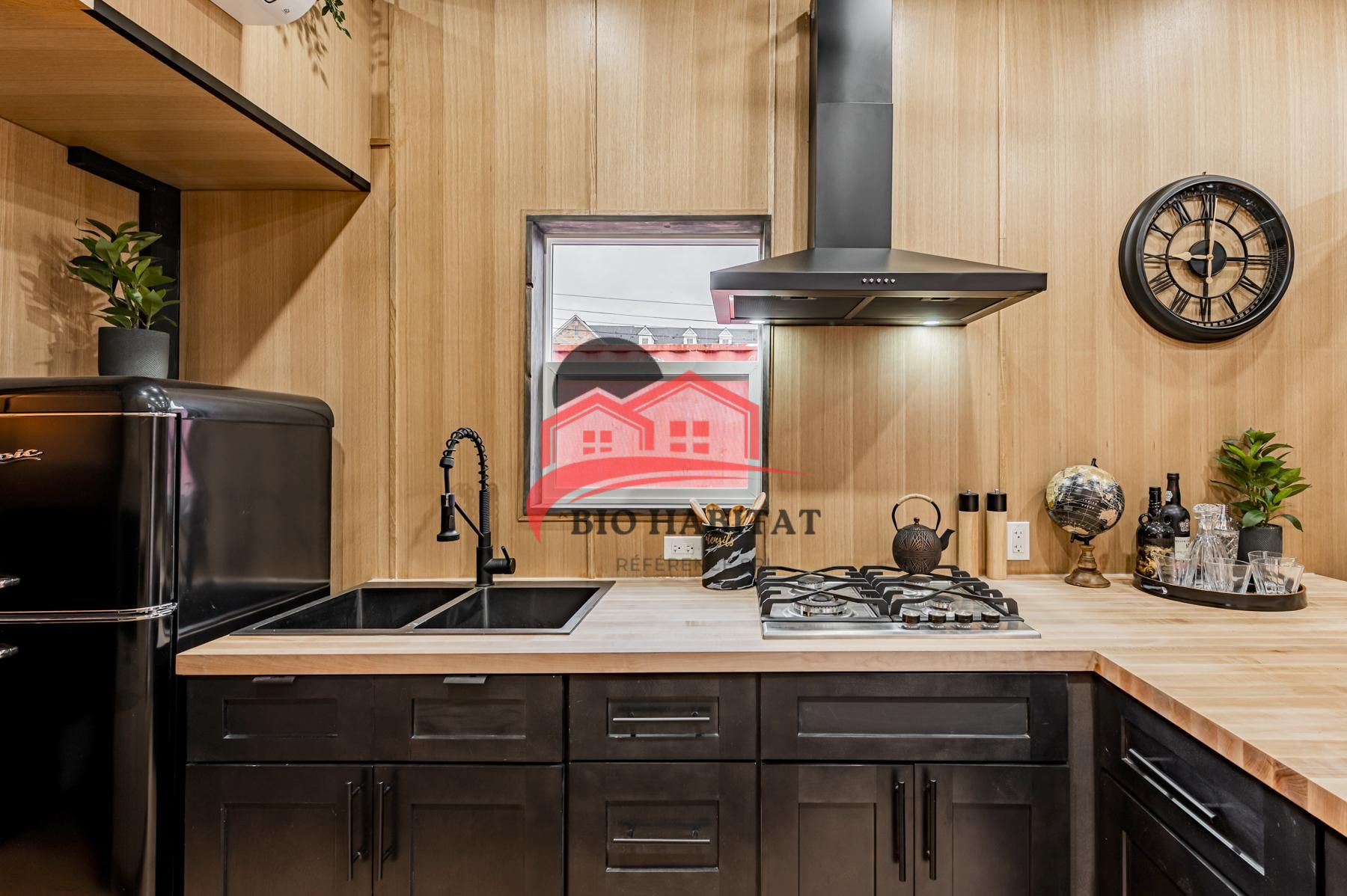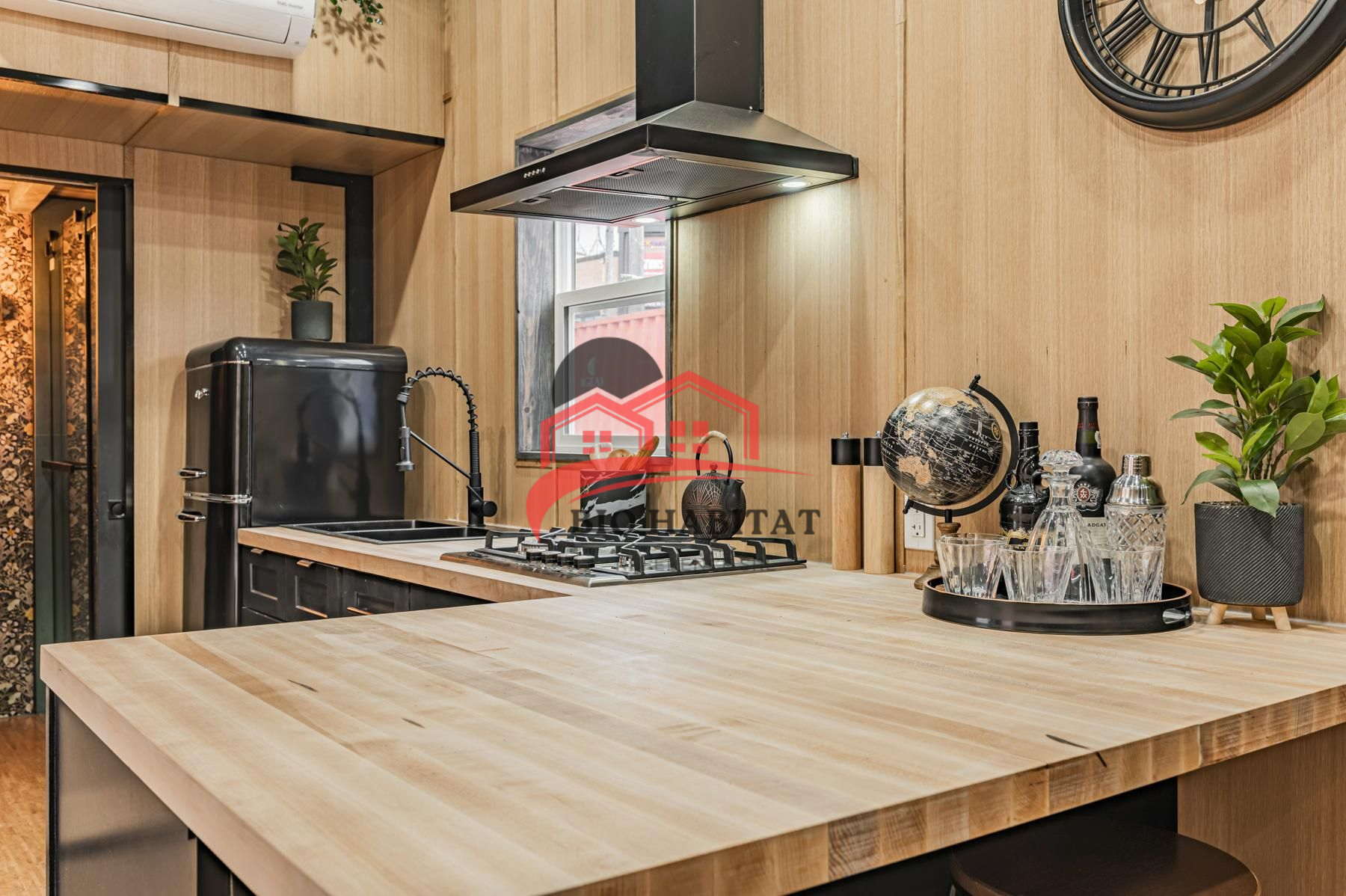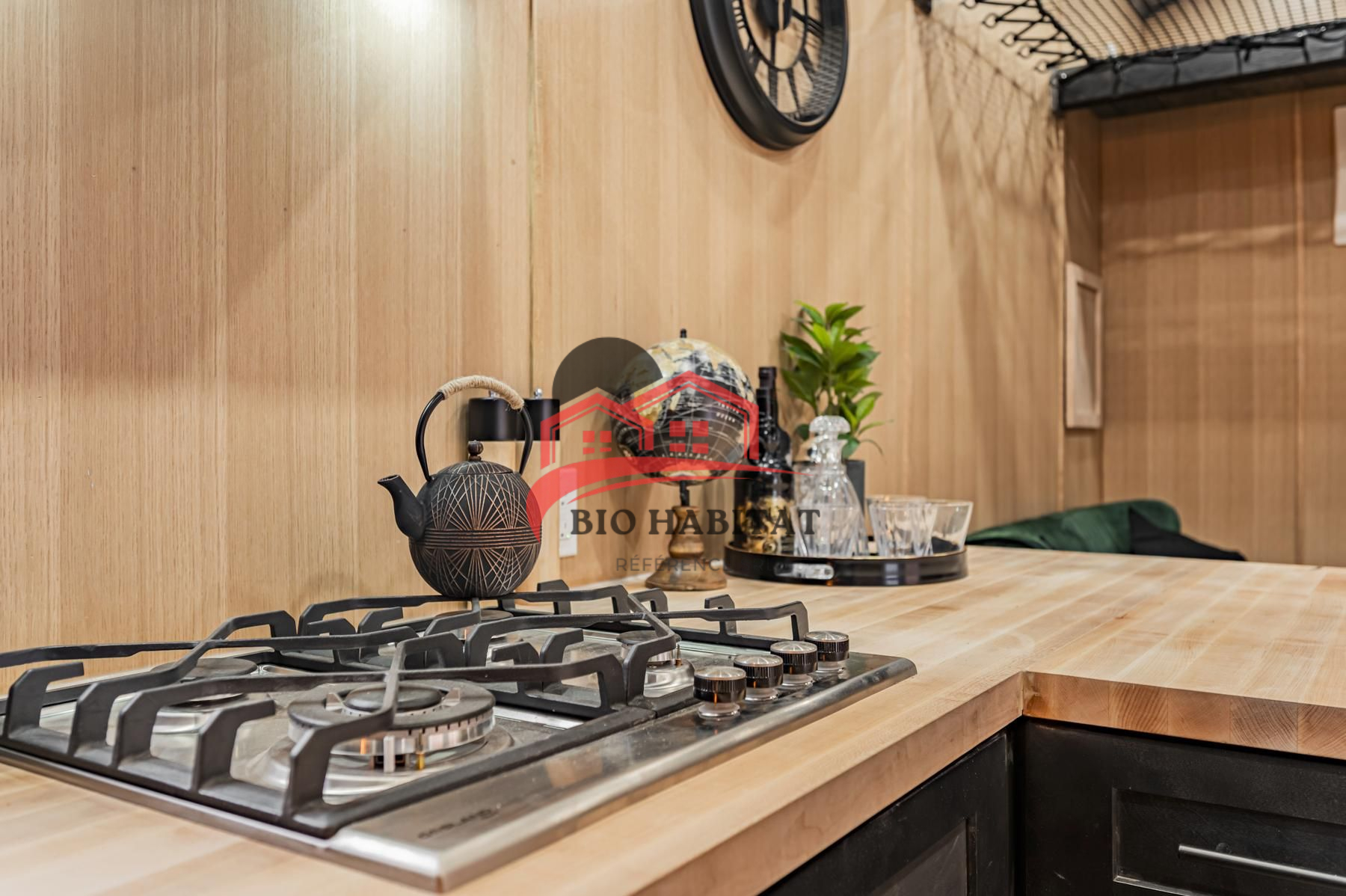 Cuisine équipée : plan de travail en bois, plaque gaz, hotte, réfrigérateur rétro, évier moderne, rangements