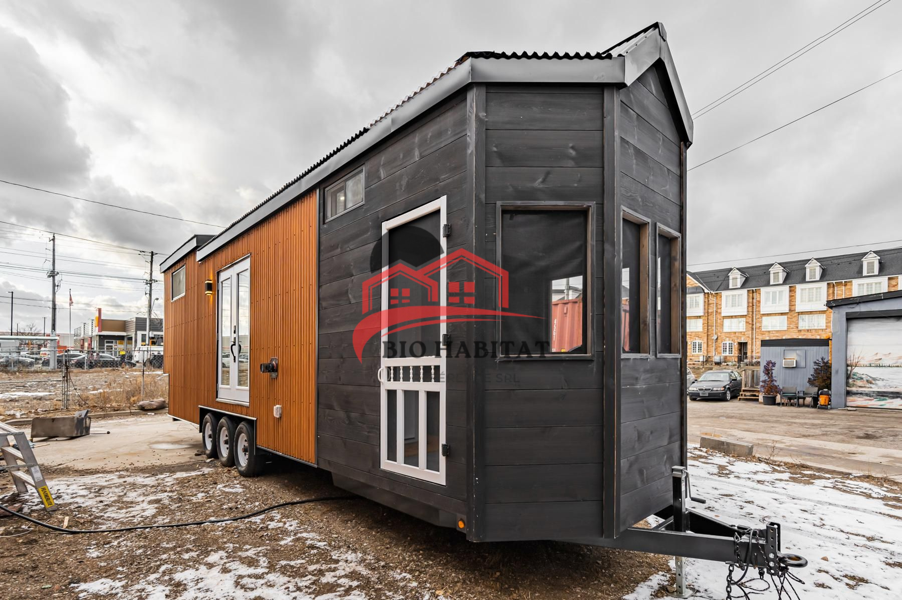 Construction solide sur châssis triple essieu, prête à être déplacée
